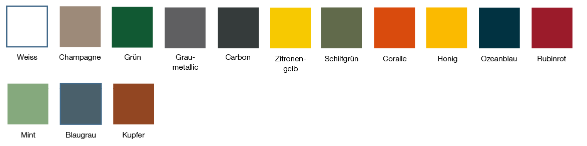 Verfügbare Farben: Weiss, Champagne, Grün, Grau Metallic, Carbon, Coralle, Honig, Mint, Blaugrau, Kupfer, Ozeanblau, Rubinrot, Schilfgrün, Zitronengelb